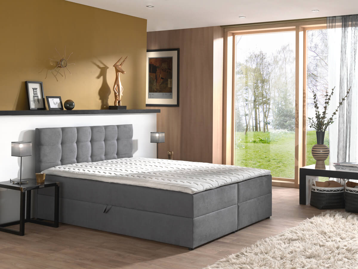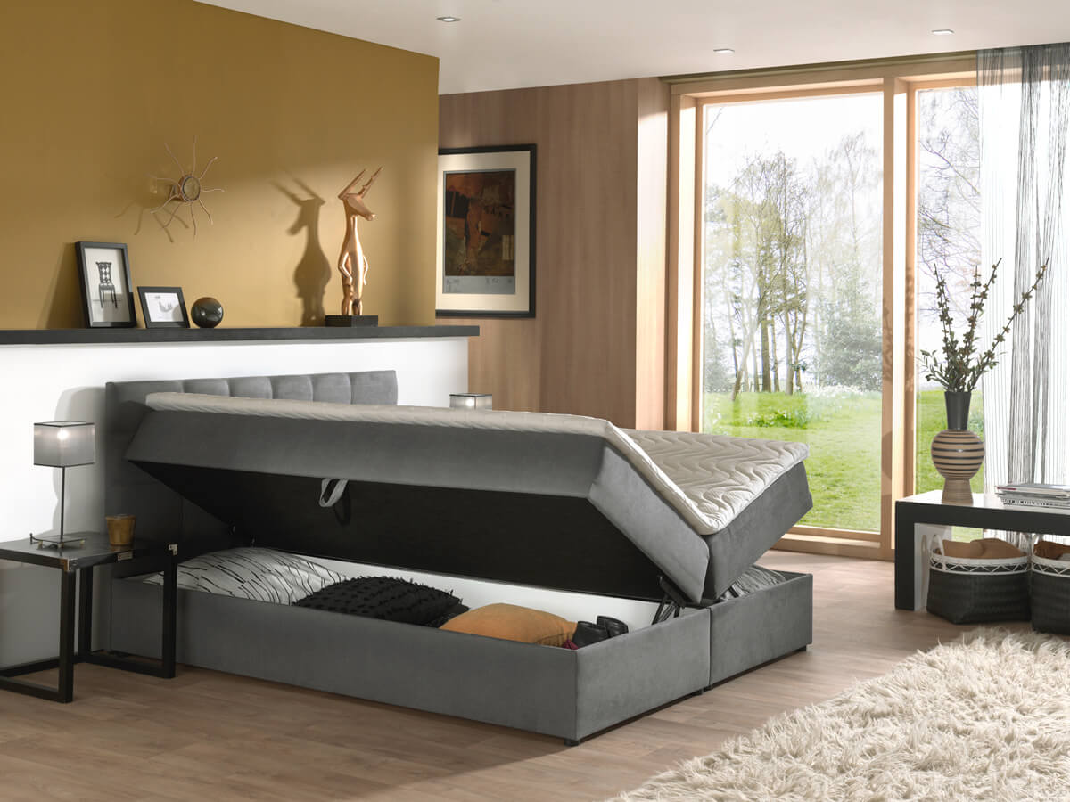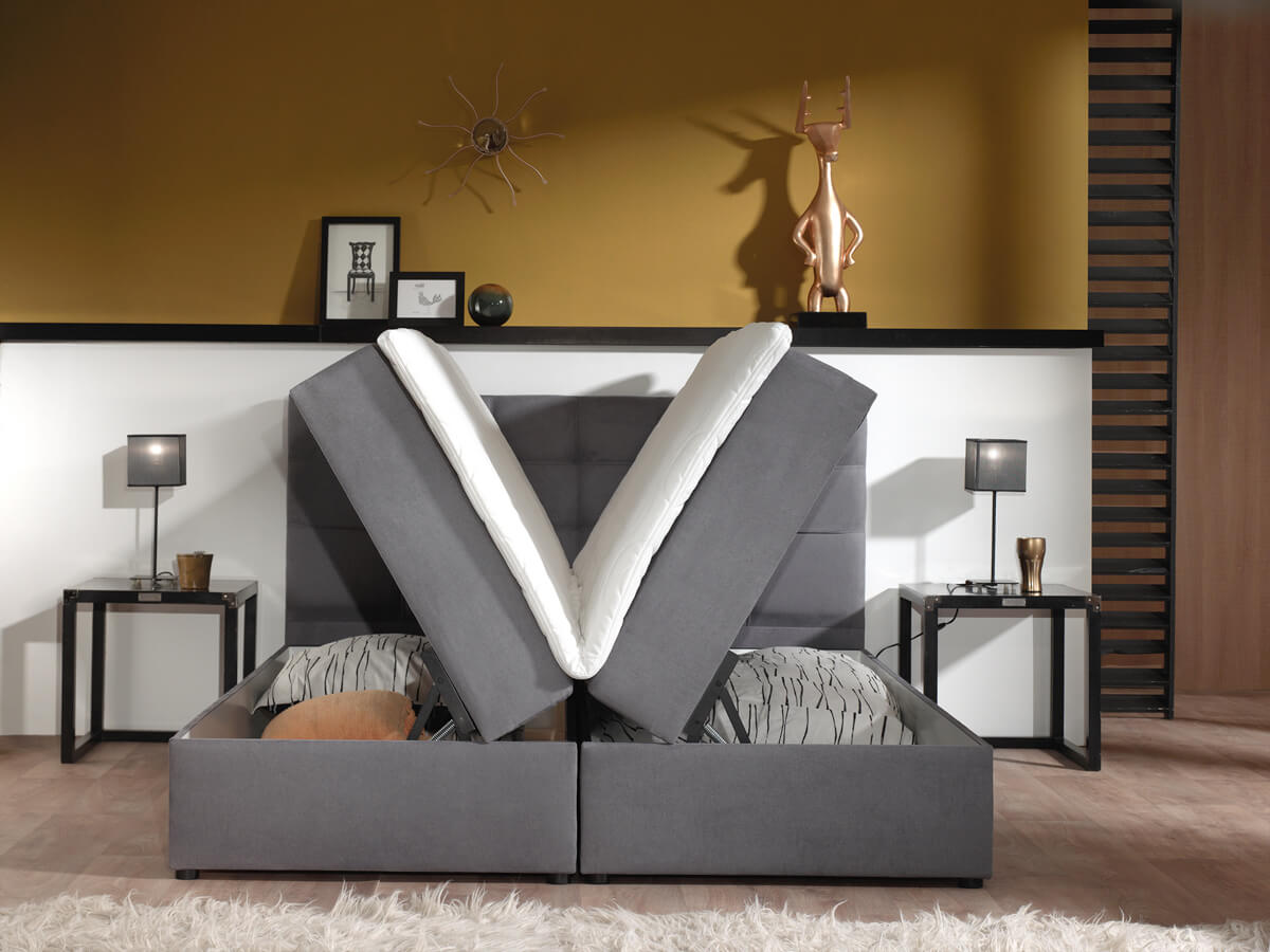 Maak kennis met de nieuwe slimme opberg boxspring Modena. Door de zeer ruime opbergruimte heb je in een handomdraai een opgeruimde slaapkamer!