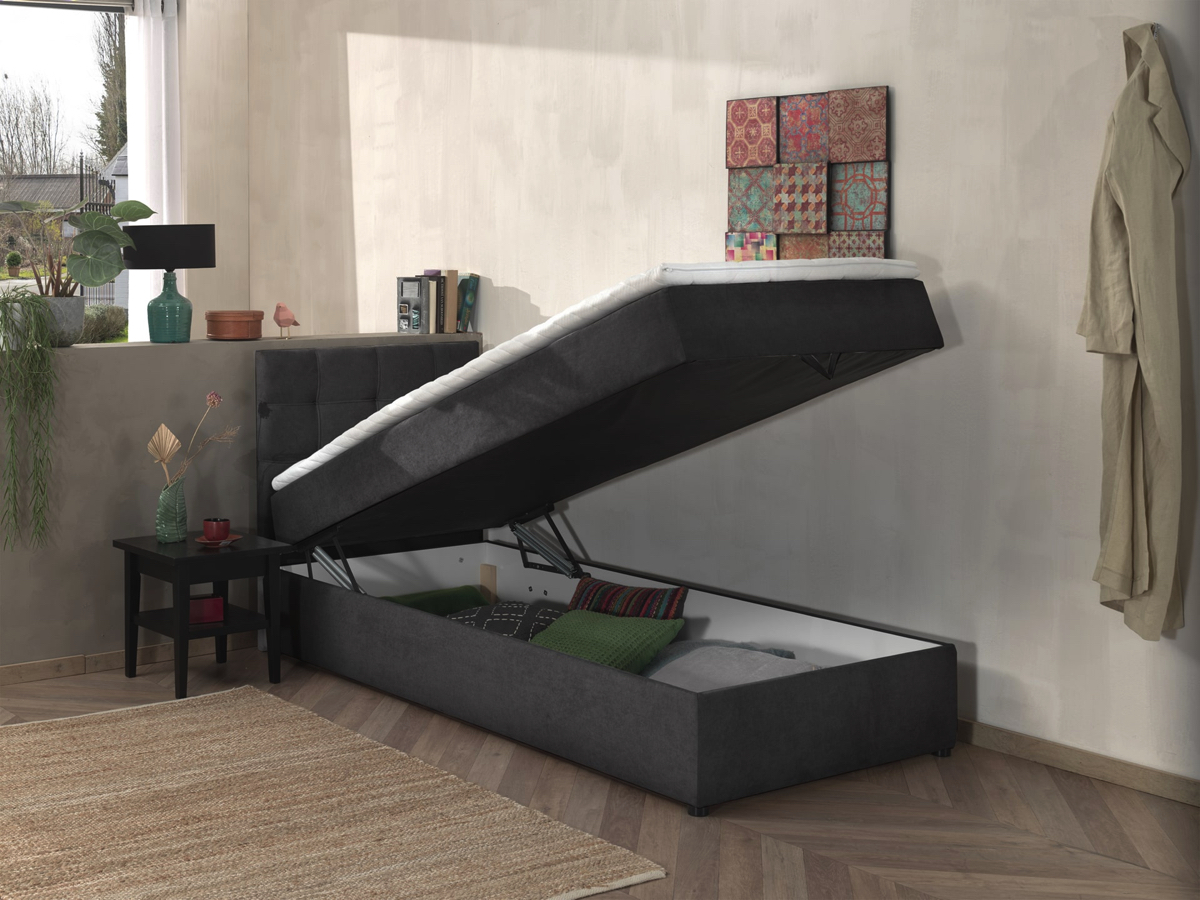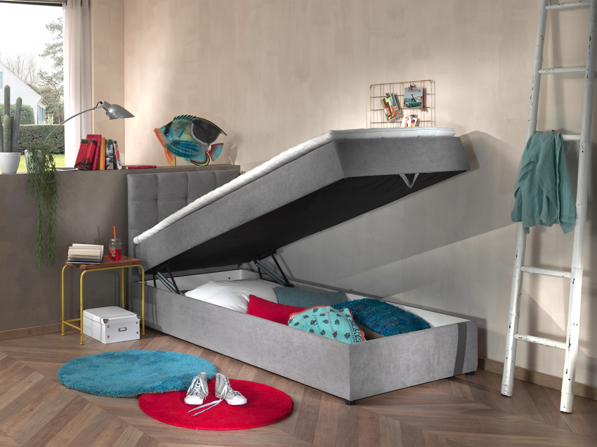 Dankzij het royale opbergvak onder het matras biedt de Single Storage Deluxe verrassend veel ruimte voor bijvoorbeeld beddengoed, kleding of koffers. De stevige veermechaniek en handige voorzijde-opening zorgen ervoor dat je moeiteloos bij je spullen kunt – zonder tillen of duwen.