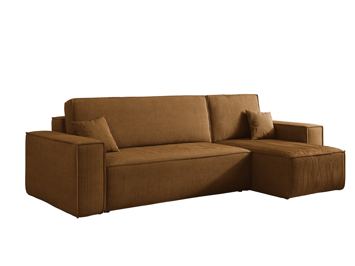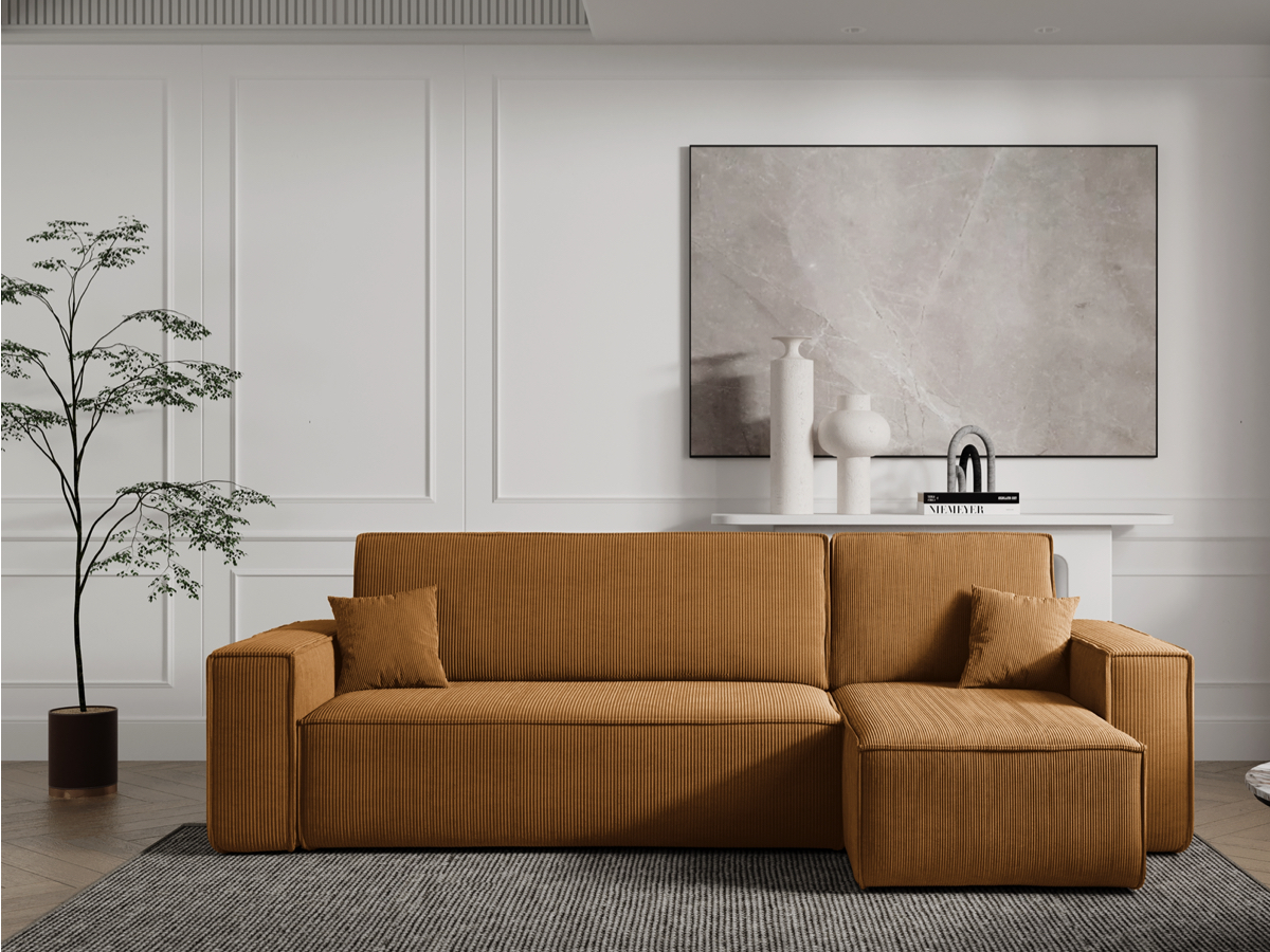De hoekbank is universeel, de keuze of hij rechts of links staat wordt gemaakt tijdens de montage.
